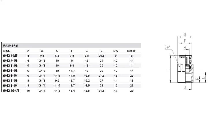 | Різьба | 1/8, 1/4, 3/8, 1/2, 3/4, М5, М6, М12х1,25 |